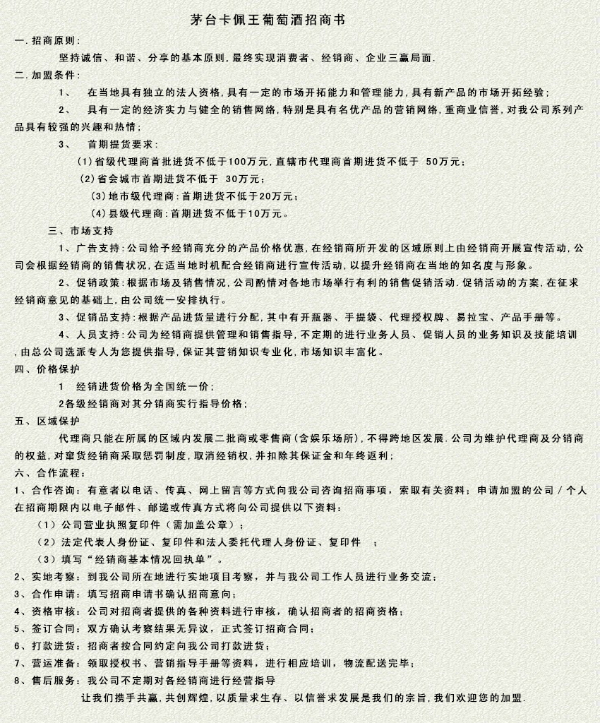 茅臺(tái)葡萄酒卡佩王系列于2002年7月組建成立。是集生產(chǎn)、銷售于一體的綜合性企業(yè)。公司注冊(cè)資本2.4億元。公司占地面積36729.1平方米,擁有一個(gè)設(shè)備完整的獨(dú)立發(fā)酵站,占地面積11700平方米,并擁有5000畝的標(biāo)準(zhǔn)化葡萄種植基地。年原酒發(fā)酵生產(chǎn)能力1.2萬(wàn)噸,成品酒生產(chǎn)能力1萬(wàn)噸。公司產(chǎn)品采用赤霞珠、品麗珠、霞多麗等優(yōu)良釀酒葡萄為原料,共有茅臺(tái)系列、卡佩王系列、禮品系列等多個(gè)干紅、干白葡萄酒產(chǎn)品。