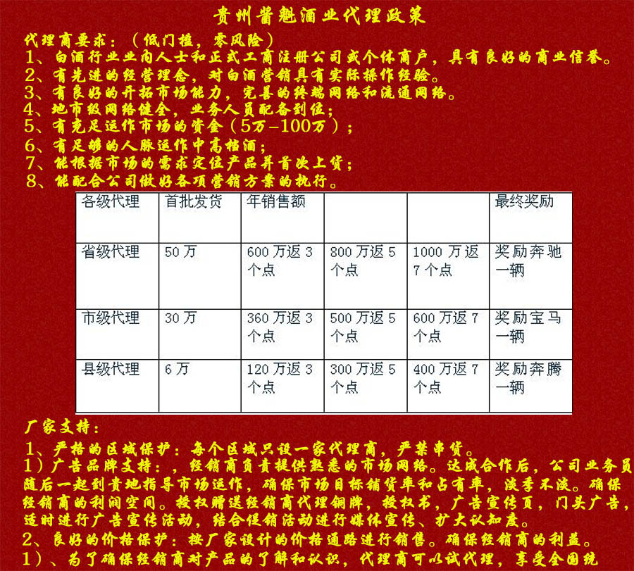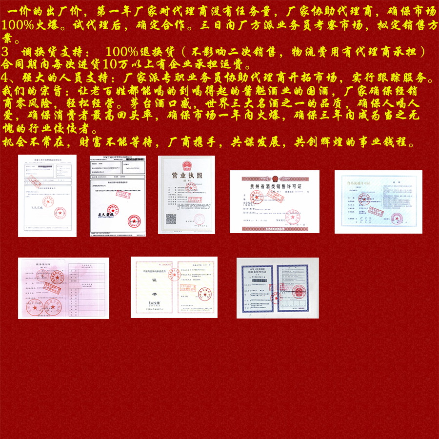 貴州醬魁酒業(yè)有限公司是生產(chǎn)白酒企業(yè)。專業(yè)從事研發(fā)、生產(chǎn)、包裝設(shè)計(jì)、品牌策劃、白酒定制,銷售為一體的白酒企業(yè),經(jīng)相關(guān)部門批準(zhǔn)注冊(cè)的正規(guī)公司。生產(chǎn)基地坐落于馳名中外的中國(guó)酒鎮(zhèn)茅臺(tái)鎮(zhèn)醬香型酒原產(chǎn)地保護(hù)區(qū)內(nèi)。醬魁酒業(yè)公司生產(chǎn)的“飛天漿臧”酒與茅臺(tái)同享得天獨(dú)厚的土壤、氣候、水源和微生物群等自然環(huán)境資源?诟写颊,幽雅細(xì)膩,回味悠長(zhǎng)。秉承茅臺(tái)酒傳統(tǒng)工藝,精心釀造、貯存、勾兌而成,具有醬香顯著、幽雅舒適、酒體豐滿、醇和協(xié)調(diào),回味悠長(zhǎng),空杯留香的獨(dú)特風(fēng)格,為宴賓饋贈(zèng)之妙品。