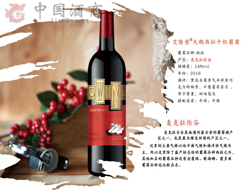 | 產(chǎn)品名稱(chēng) | 艾隆堡®天鵝西拉干紅葡萄酒 | 產(chǎn)品類(lèi)別 | 葡萄酒招商 |